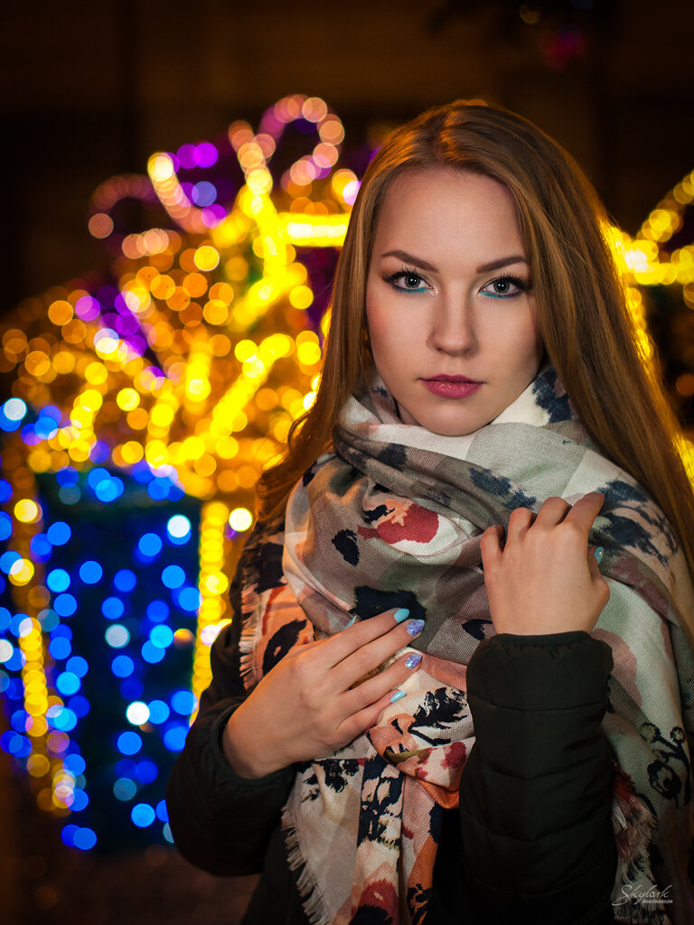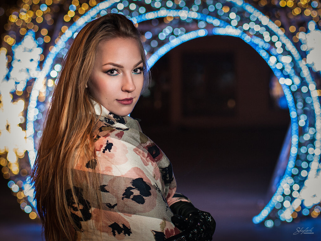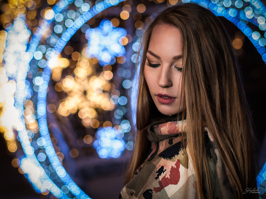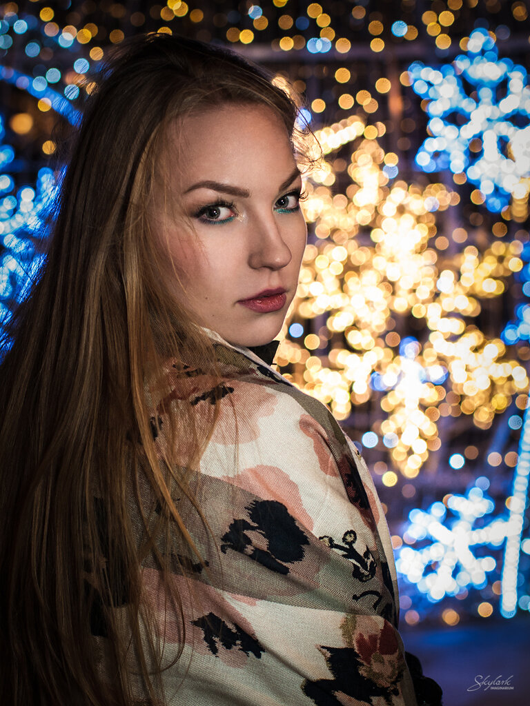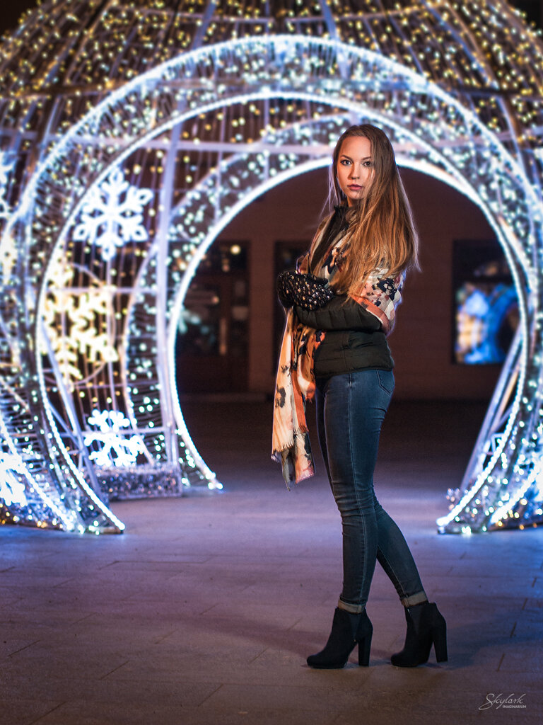 Sesja ze światełkami w tle ;) W tym roku dekoracja świąteczna na ulicy Piotrkowskiej w Łodzi została stworzona z myślą o portrecistach. Żartuję oczywiście. Co roku ta reprezentacyjna ulica Łodzi jest niesamowicie rozświetlana, jednak w tym roku pojawiły się nowe instalacje. Zostały one tak zaprojektowane, że w łatwy sposób mogły zostać wykorzystane jako świetliste tło do portretów. Nie mogłem takiej szansy przegapić. Dodatkowo niezimowa pogoda sprzyjała w wieczornym foceniu (no dobra, zimno było ale nie aż tak jak mogło by być).